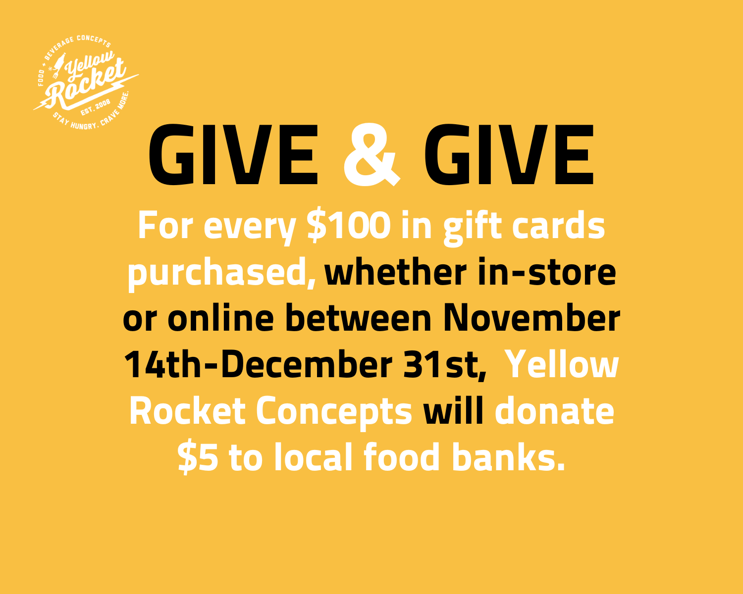 Yellow Rocket Concepts (YRC) is launching a community-focused gift card program designed to provide direct financial support to local food banks across its operating regions this holiday season.The initiative that will run from this Friday, November 14th to the end of the year is simple: for every $100 in gift cards purchased in a single transaction, whether in-store or online, YRC will automatically donate $5 to a local food bank serving the community where the purchase was made. This will piggy-back off of YRC’s recurring Holiday promotion, “Bonus Bucks,” which runs from Friday, November 28th through Wednesday, December 31st— where guests receive a $20 bonus bucks card for every $100 spent on gift cards. The Bonus Cash is valid 1/2/26 through 3/31/26 only.In addition to fundraising, each of our restaurants is committing to hands-on community support by organizing local food bank volunteer days for team members.
